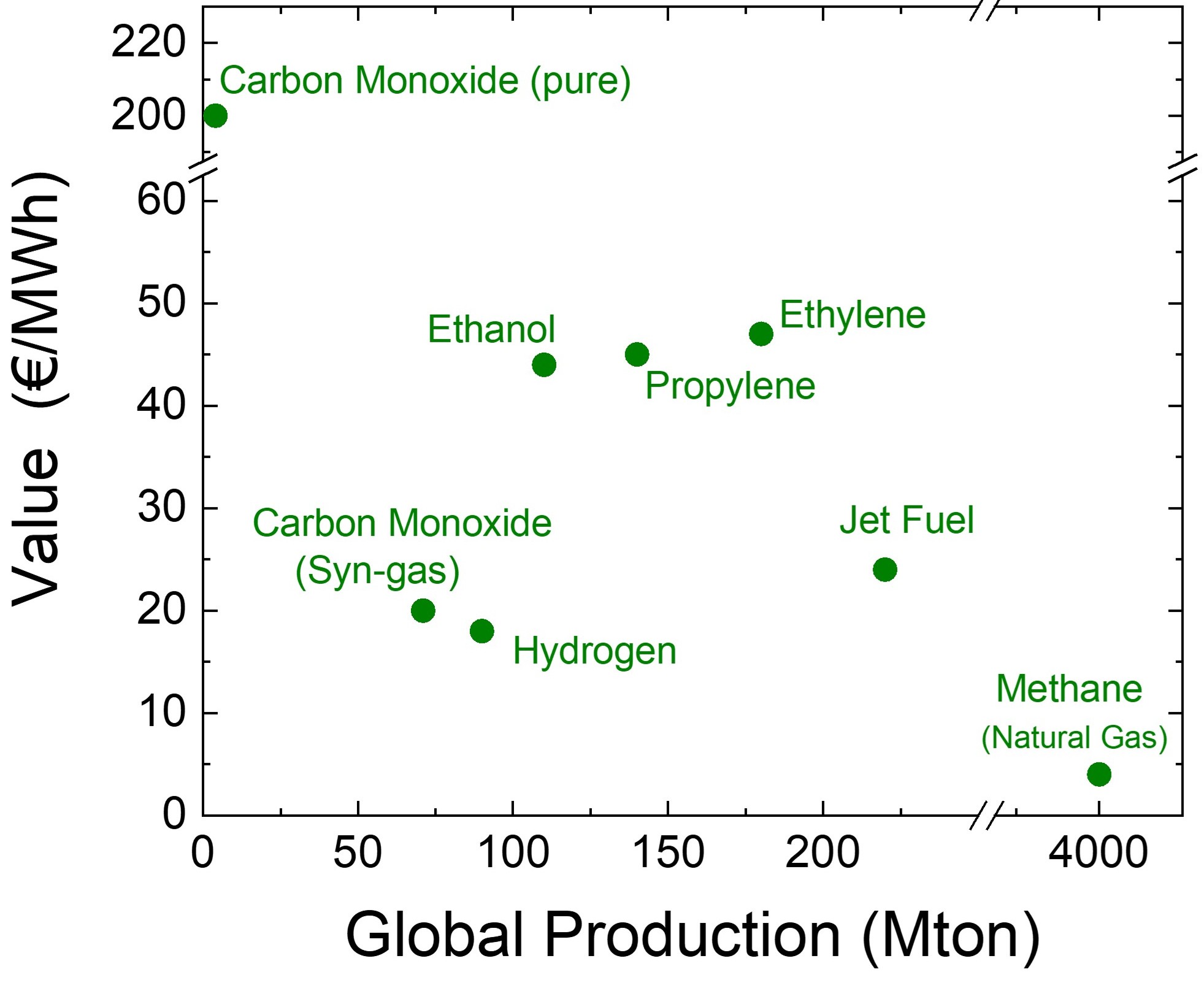 related to the price to produce the species. For something like coal or oil the mass directly relates to how much something costs to dig or pump it out of the ground, thus 'tons' can roughly be thought of as 'cost to produce'. However for electrochemical processes the cost to produce is the number of electrons needed to make the product, thus 'MWh' is a more appropriate cost to produce. Given that both hydrogen and all CO2 electrolysis products have similar thermodynamic potential needed to produce them, they all will operate at similar voltages. It takes 2 electrons to produce hydrogen (H2) and 2 electrons to convert CO2 to carbon monoxide (CO). Thus the power to produce a molecule of each should be similar. However, a molecule of CO is 14 times heavier than a molecule of H2. Given that we sell products based on mass, the value of carbon monoxide will be much more promising via the electrochemical approach. Thus a better way to plot value of products is in terms of $/MWh. That is done on the second chart. When this chart is used it is clear that the CO2 electrolysis products have a much higher value than hydrogen. A practical point to note is that pure CO is much more valuable than syn-gas (i.e. mixture of CO and H2). The reason for this is that much of the cost of pure CO relates to the safety issues related to shipping it. Syn-gas is poduced in refineries and used in refineries eliminating any transport safety issues. Thus on-site CO2 to CO electrolyzers will derive much of their economic benefits due to reducing safety hazards. The issue with CO brings up an important point that CO2 electrolyzers first beachead into commercial market will need to take advantage of their added benefit beyond sustainability. Given the vast amount of chemicals used in today's society, there are plenty of niche markets that CO2 electrolysis can take advantage of. These markets may not impact the world's CO2 problem, but if they are sustainable, economic and can build a supply chain for future electrochemical developments it does not matter. |