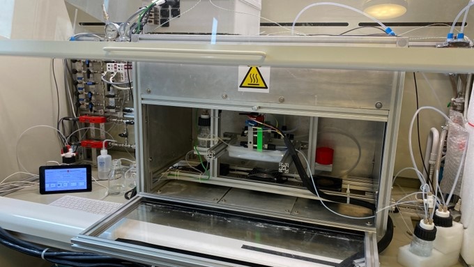 Our test cells typically run either 5 cm2 or 25 cm2 devices. We do CO2 reduction on the cathode and oxygen evolution on the anode. Operating the system at elevated temperatures is difficult to maintain a consistent temperature, however we operate at 30C, which is enough to mitigate changes in room temperature, but not too hot to create large temperature gradients.