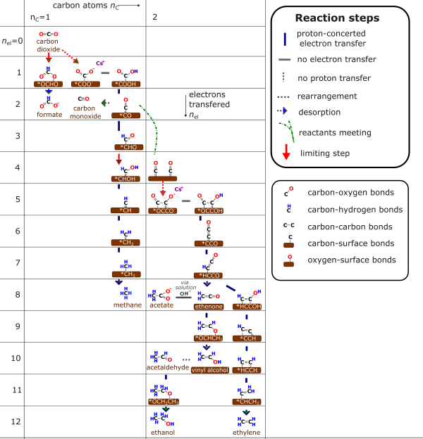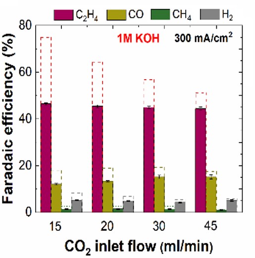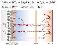 engineering The rate limiting step for CO2 electrolysis is either the first electron transfer into CO2 (for Ag, Au, Sn...) or for Cu, the coupling of 2 CO's to form an OCCO intermediate. In neither of these cases is a proton involved, whereas in the competing water electrolysis to H2 gas, a proton is involved in the rate limiting step. Because of this, operating more alkaline favors CO2 electrolysis products versus low value H2 evolution. The obvious solution would then be to go to as high a pH as possible. However highly alkaline conditions (think high KOH- concentration) reacts with CO2 to form either HCO3- or if it is very alkaline CO32-. This effectively buffers the maximum pH one can operate to the pH of CO32-, which is around pH =12. This causes 2 major issues. Issue #1 The first issue that many researchers tried operating in KOH (i.e. alkaline solutions) thinking that they could react the CO2 before it would interact with the KOH. To do this they would use a gas diffusion layer approach, which is the same optimized engineering design approach that fuel cells and the chloro-alkali industry uses. A practical issue is that any CO2 that was reacted with KOH to form solubilized K2CO3 would decrease the outgoing gas flow rate. This in itself is not a major issue, but the main method to detect gaseous products (gas chromatograph) only detects concentration rath